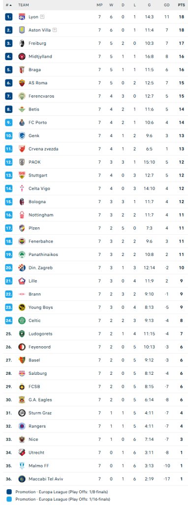 Από την άλλη ο Παναθηναϊκός πήρε στη Βουδαπέστη το 1-1 με τη Φερεντσβάρος, σώζοντας την παρτίδα με το τέρμα του Ζαρουρί και επίσης εξασφάλισε θέση στην 24αδα, με την ομάδα του Ράφα Μπενίτεθ να είναι στη 19η θέση με 11 πόντους στο +4 από την 25η Λουντογκόρετς. Όσον αφορά την 8αδα; Μαθηματικά το «τριφύλλι» έχει κάποιες ελάχιστες ελπίδες αλλά αυτό απαιτεί νίκη με Ρόμα με αρκετά τέρματα και παράλληλα ήττες ομάδων που έχουν 13 και 14 βαθμούς…