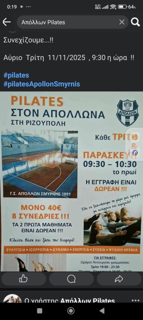 Είναι αδιανόητο, αλλά είναι αληθινό… Μας το είπαν, το θεωρήσαμε μπλακ χιούμορ, αλλά δυστυχώς είναι πραγματικότητα. Τα ξεφτιλίκια στον ιστορικό Απόλλωνα Σμύρνης δεν έχουν τελειωμό. Έτσι μπροστά στο εμπόριο δεν υπάρχουν ηθικοί φραγμοί. Στον Ερασιτέχνη έχουν φτιάξει τμήμα pilates, ναι σωστά διαβάζετε… Χωρίς δείγμα ντροπής το λένε «Απόλλων pilates», το διαφημίζουν στα social media μάλιστα και η μηνιαία συνδρομή κοστίζει 40 ευρώ με τα μαθήματα να παραδίδονται στο κλειστό του μπάσκετ!