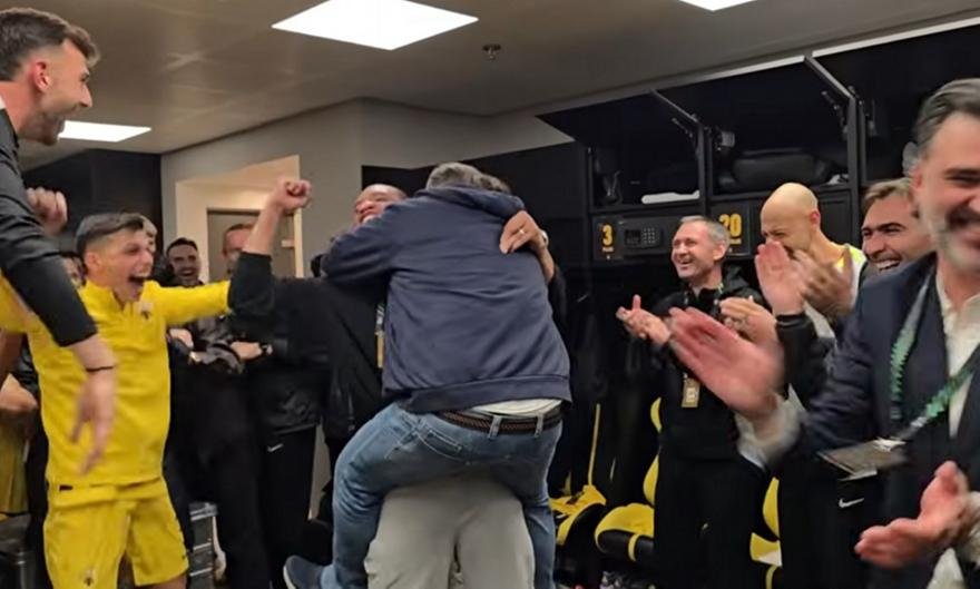 Ο ιδιοκτήτης της Ένωσης, ήταν αρκετά ευδιάθετος και περιχαρής με όλους, ενώ πήδηξε στην αγκαλιά του Μουκουντί και άρχισε και ο ίδιος να χοροπηδά μαζί του, πριν μπούνε στην… παρέα και οι υπόλοιποι παίκτες.