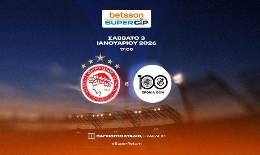 To Super Cup επιστρέφει. Εξασφαλίζουμε τη θέση μας στο ποδοσφαιρικό καλωσόρισμα του 2026! Ολυμπιακός-ΟΦΗ στις 3 Ιανουαρίου στο Παγκρήτιο Στάδιο στις 17:00, ένας αγώνας που επανέρχεται με τη στήριξη της Betsson 18 χρόνια από την τελευταία φορά που διεξήχθη.